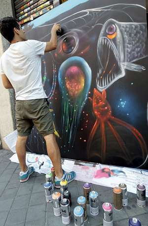 Es un «todos contra la pesca de arrastre», una propuesta que se planta en el asfalto del centro de Madrid en el día más caluroso del año. Se pretendió organizar el acto delante del Ministerio de Agricultura, pero fue prohibido por las autoridades. Es también Madrid el único lugar de estas acciones simultáneas llevadas a cabo (en Biarritz, Londres, Bruselas...) en donde no se permite. Pero el artista callejero pinta y pinta, y un fondo negro marino aparece frente a los transeúntes de la calle Colegiata 9, a escasos metros de Tirso de Molina, donde se ubica el siempre hospitalario Utopic_Us, un espacio de coworking que se ha hecho célebre en la capital.